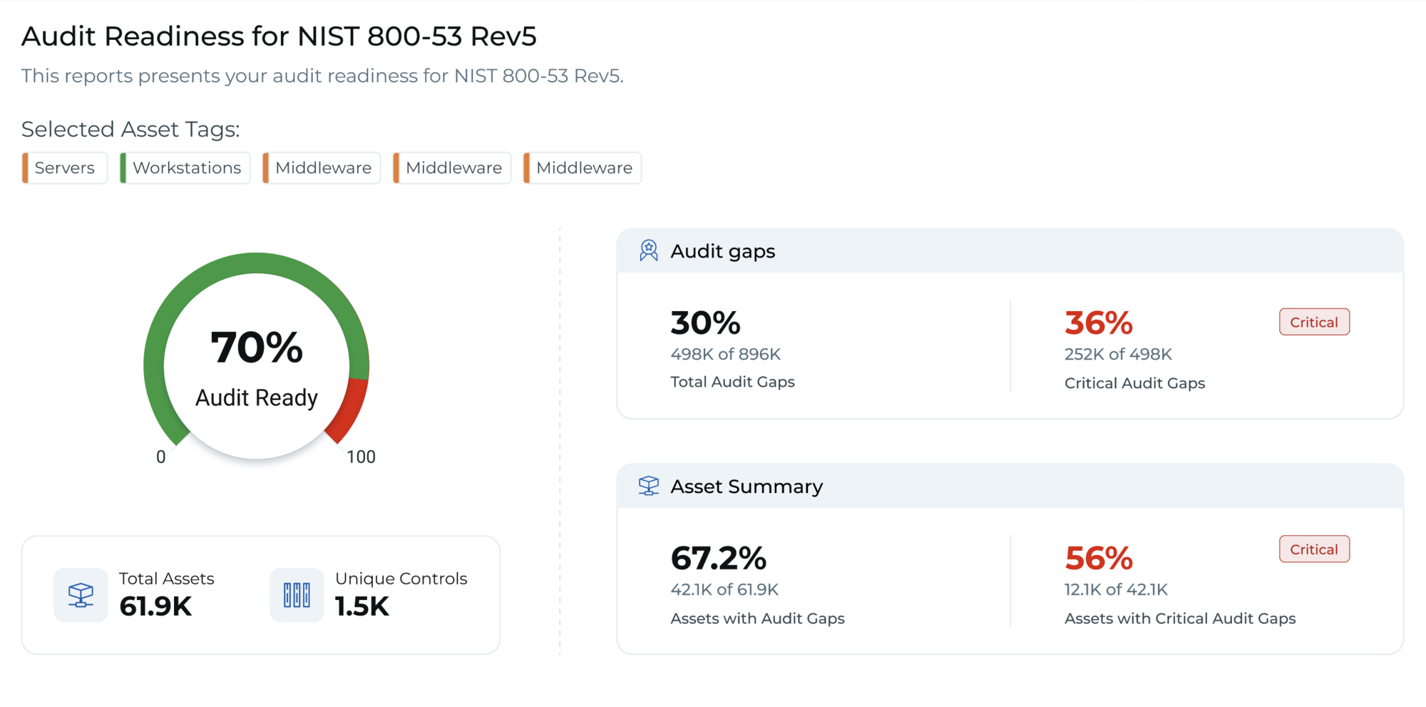 - Audit-Ready Reporting: Multiple reports are automatically generated from a single data collection, leveraging 90+ pre-mapped mandates to easily monitor compliance trends risk levels and mandate adherence. These customizable audit-ready reports for executives and stakeholders streamline on-demand audits and ensure compliance and reduce audit costs by 50%.